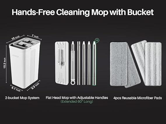 [Mop Bucket Set] Flat squeeze mop bucket set. A self-cleaning mop reduces your time and labor, allowing the bucket to handle more than you can on your own. Mopping is simplified between the mop and bucket, keeping you away from dirty water; all you need to do is insert and pull the mop